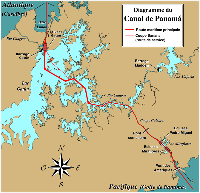 - Pour traverser entièrement le Canal de Panama, les navires doivent franchir trois écluses montantes, puis trois écluses descendantes, après avoir navigué sur le Lac Gatún.